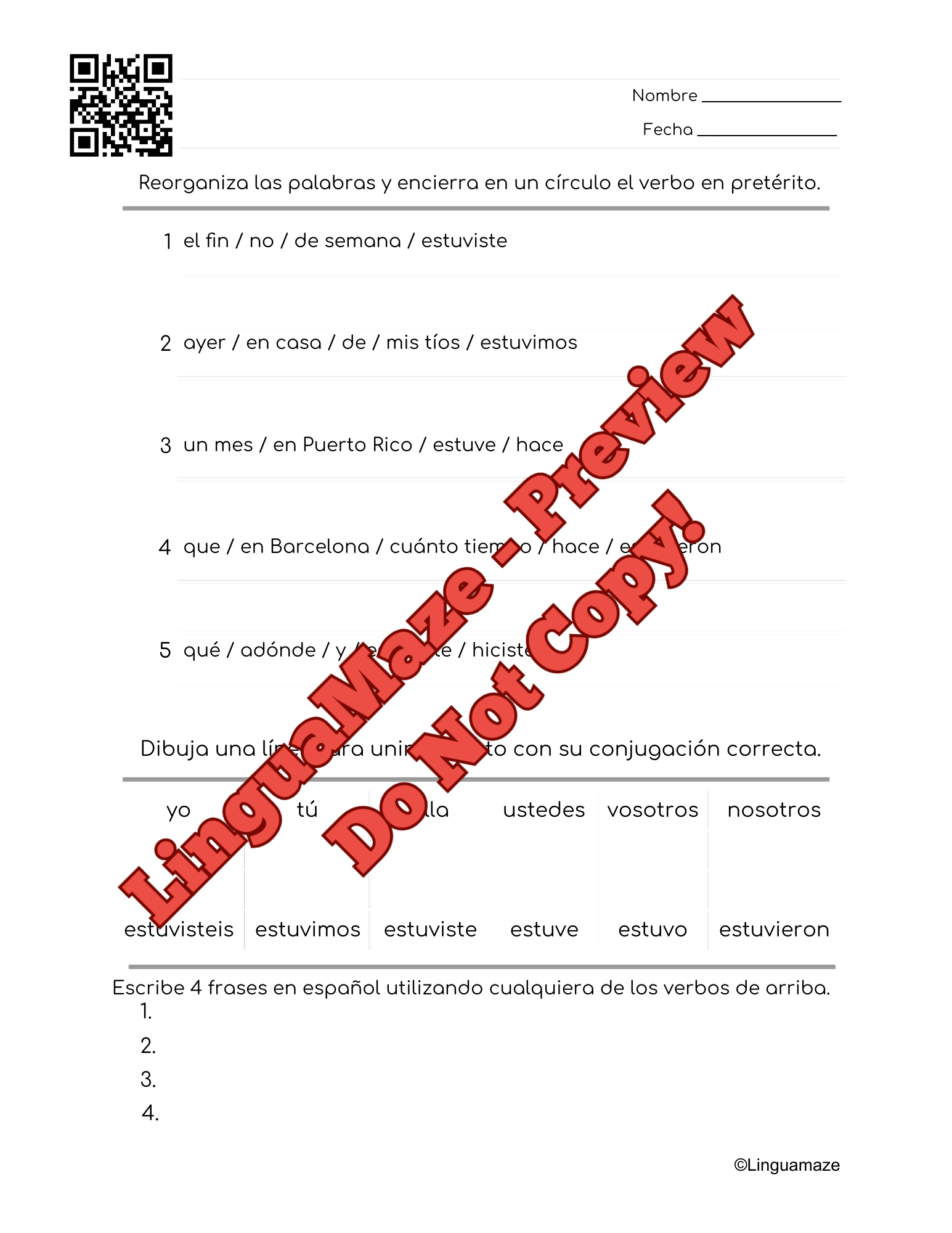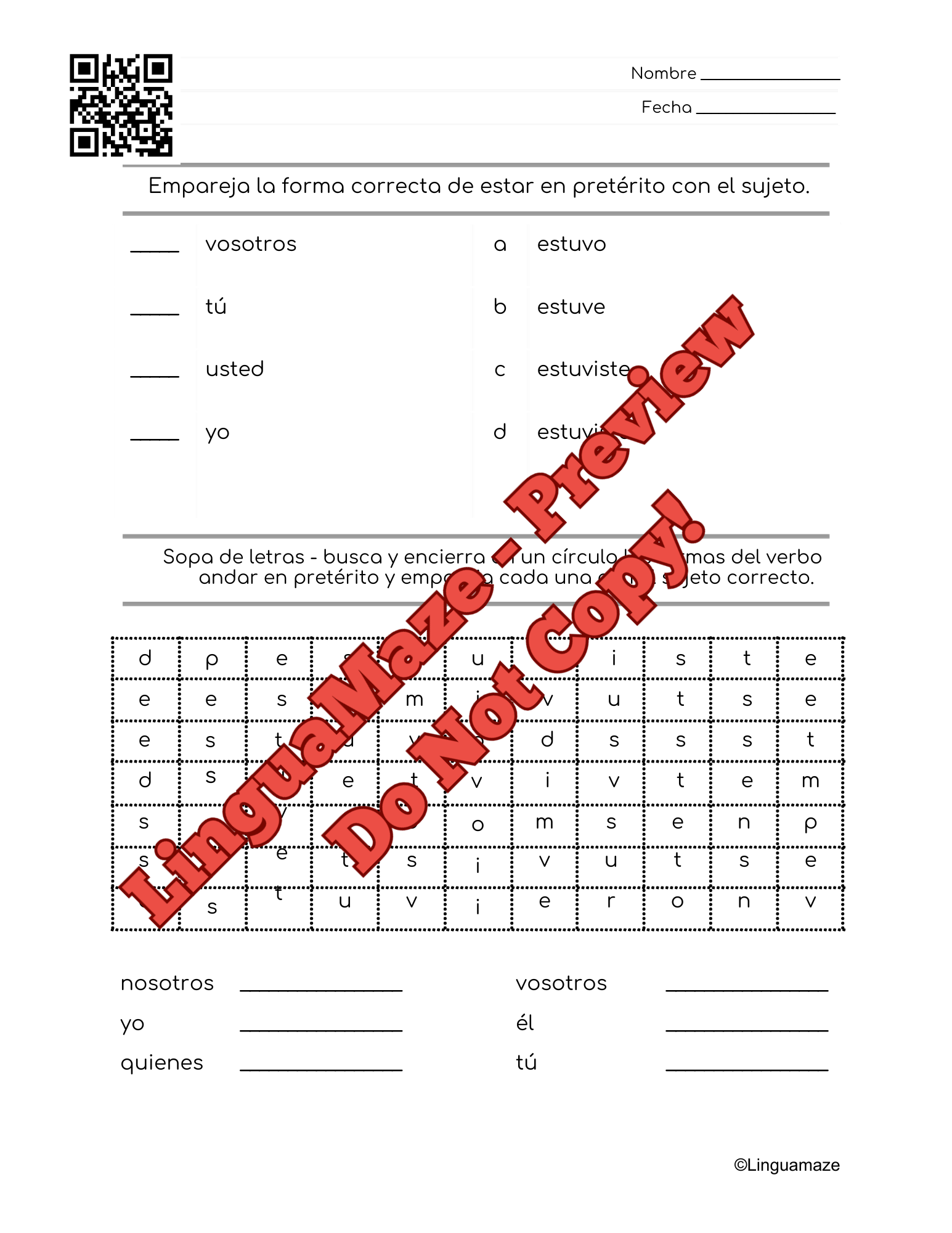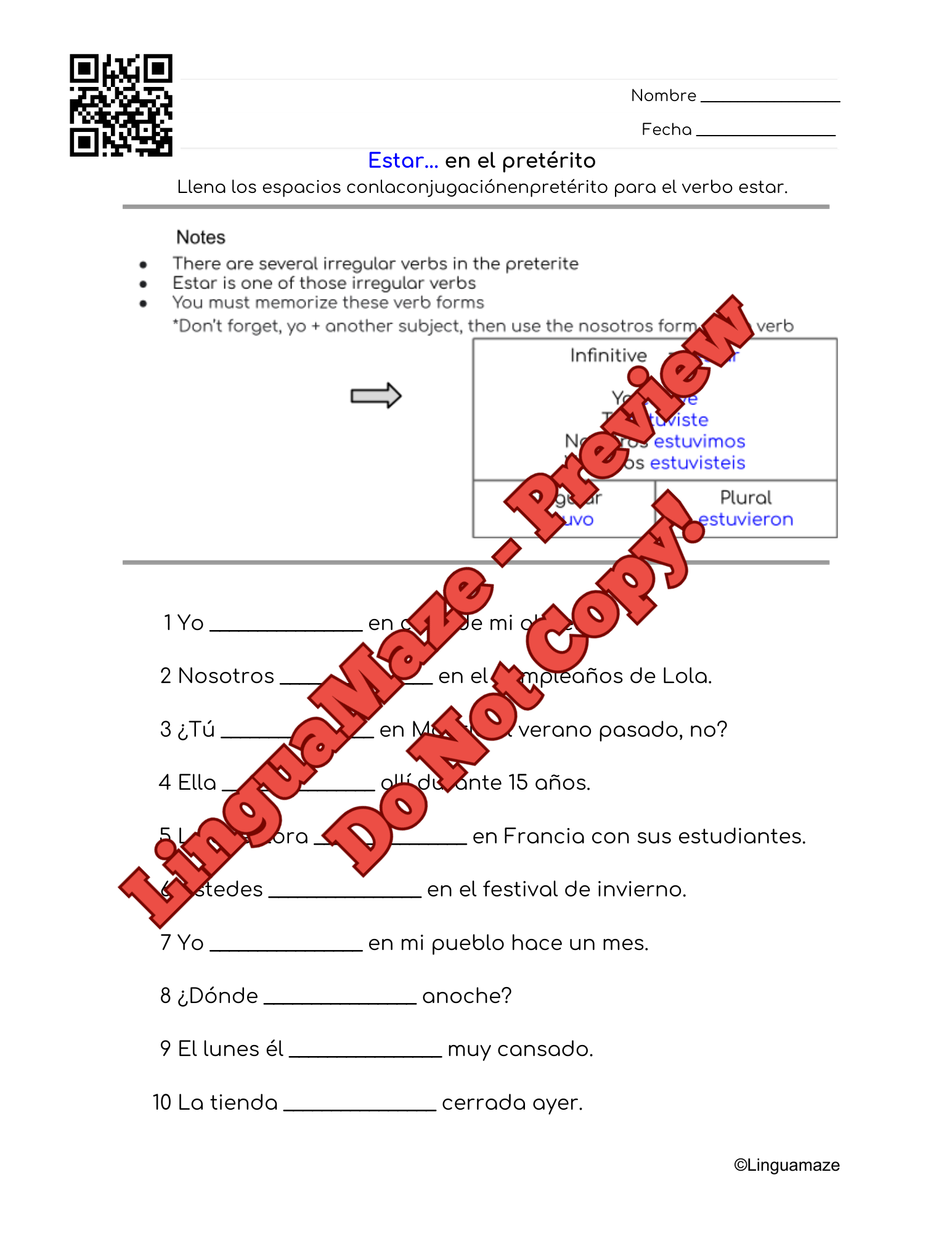 Downloadable printable sheets for young Spanish learners. Includes the Estar Irregular Spanish Preterite Tense Verb. These printable worksheets are great for beginner Spanish learners. Because these are printable, you are able to print as many copies as you need. If you are a Spanish teacher, you can use this Spanish printable year after year. Teacher key provided.