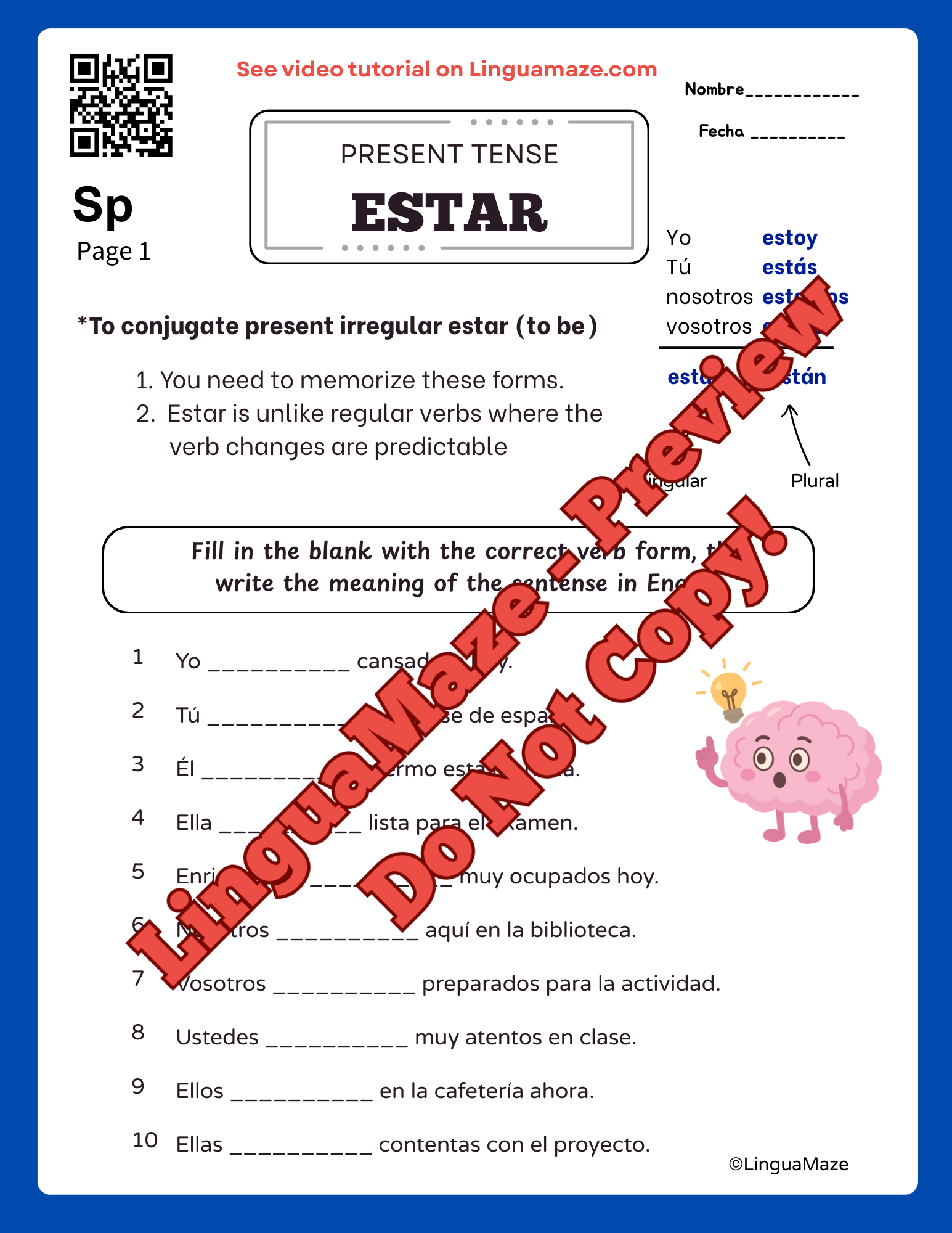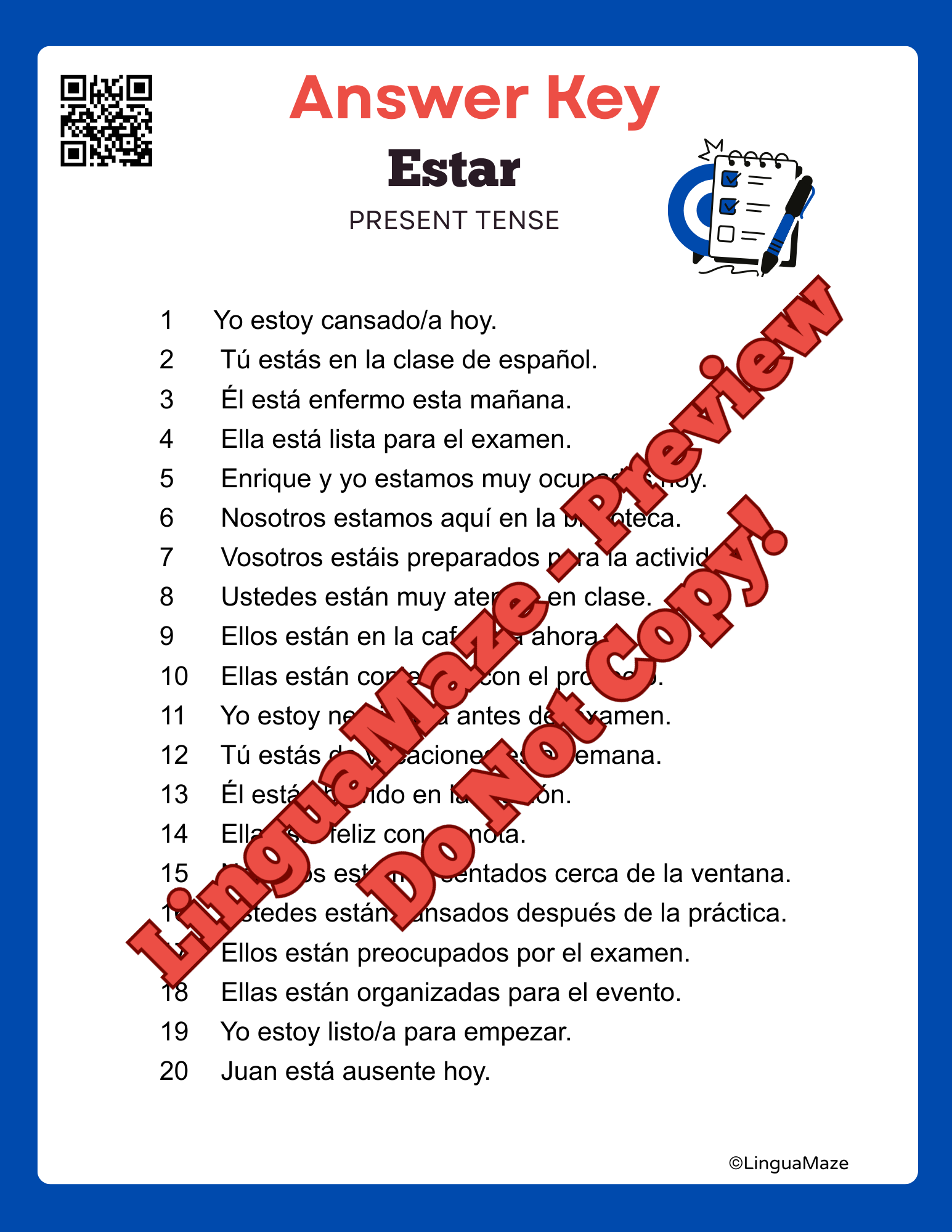 This resource includes a two-page student worksheet designed to help learners practice the present tense of the verb estar. Students complete 20 fill-in-the-blank sentences, using a provided verb chart to choose the correct form of estar. Vosotros included.